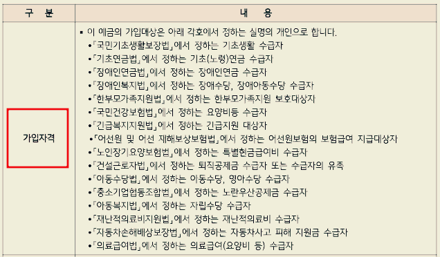 구체적으로는 아래와 같이 다양한 사회복지·보장 제도의 혜택을 받고 있는 수급자들이 해당됩니다.