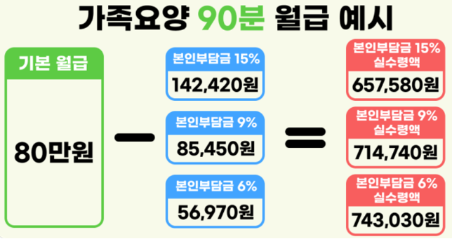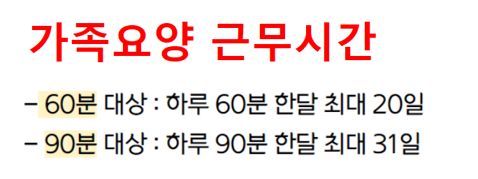 앞서 설명한 바와 같이, 가족요양은 하루 근무 시간에 따라 60분과 90분 두 가지 형태로 나뉘며, 이에 따라 월별 급여에도 차이가 발생합니다. 60분 근무는 월 최대 20일까지만 인정되며, 90분 근무는 조건 충족 시 월 최대 31일까지 급여를 지급받을 수 있습니다.
