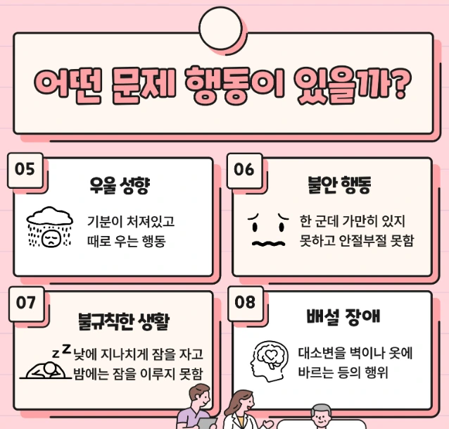 - 식사를 거부하거나 음식이 아닌 것을 먹으려 하는 행동 등 식사와 관련한 이상행동
