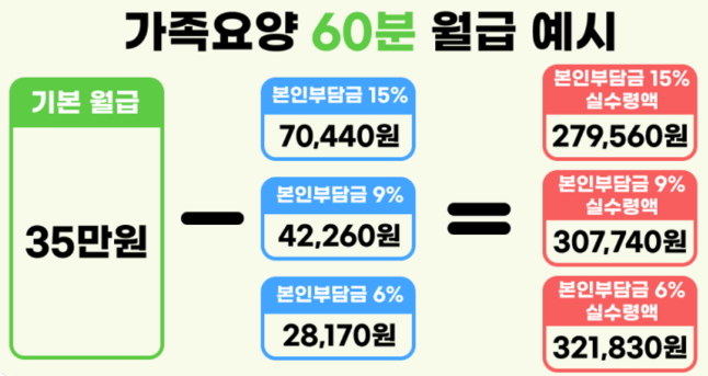 보통의 경우, 가족요양에서는 60분 서비스를 기준으로 근무하는 보호자가 많으며, 월 20일 기준으로 근무 시, 세금과 본인 부담금을 제외한 실수령액은 약 30만 원에서 35만 원 사이입니다.