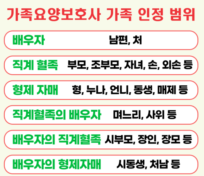 - 배우자, 자녀, 손자녀, 며느리, 사위, 부모, 형제자매 등 대부분의 직계 가족 및 그 배우자들이 해당됩니다. 다만, 구체적인 요건은 계약을 맺는 요양기관이나 국민건강보험공단을 통해 재확인하는 것이 좋습니다.