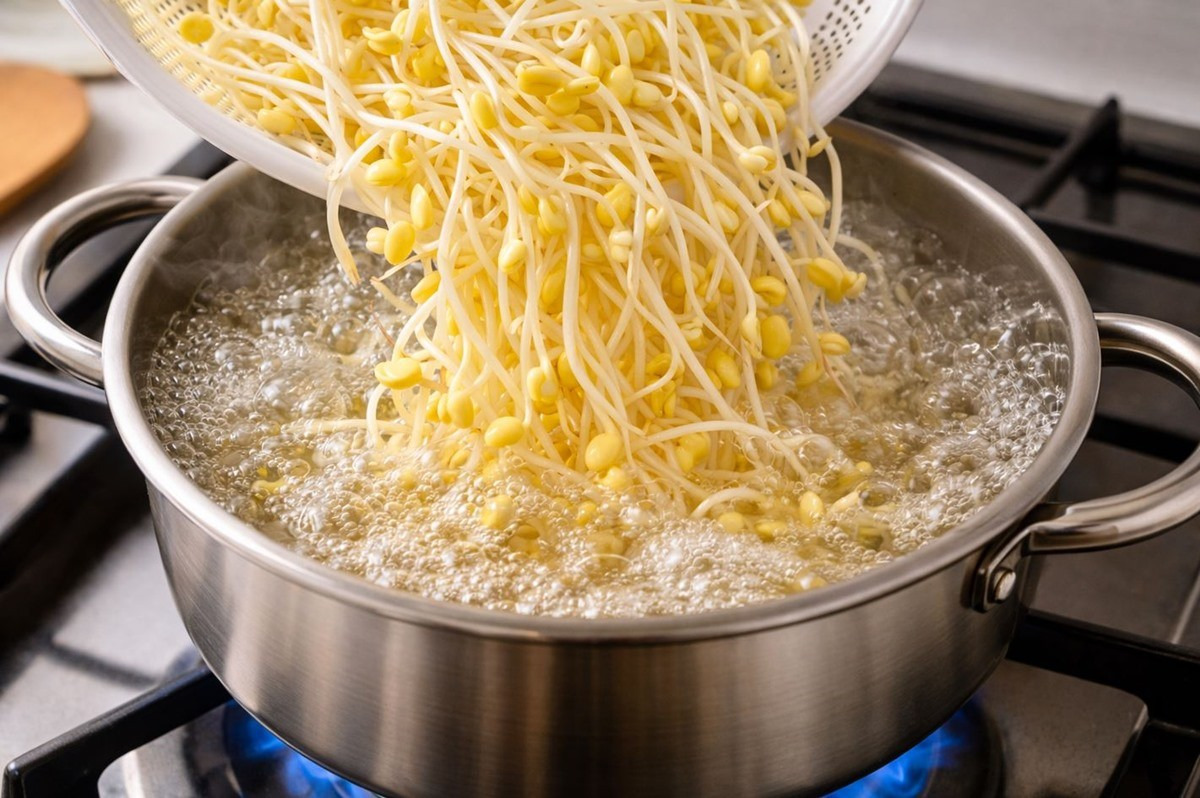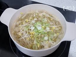 냄비에 물을 넣고 끓기 시작하면 콩나물을 넣고 뚜껑을 열어 중불에서 약 5분 정도 끓여줍니다. 이 과정에서 콩나물이 익으면서 시원한 맛이 우러납니다.