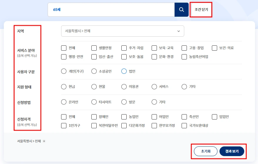 '조건보기' 버튼을 활용하면 지역, 지원 유형, 서비스 분야, 신청 조건 등 다양한 필터를 선택하여 보다 정교한 검색이 가능합니다.